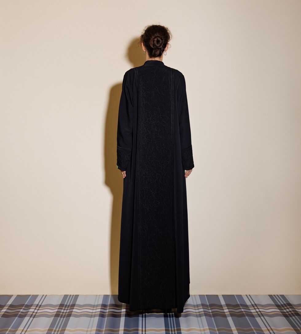Subtle sophistication meets modern artistry in the Black Orbit Abaya. This design features intricate circular embroidery flowing across the back panel and cuffs, creating a refined geometric pattern that adds texture and depth to the timeless black silhouette.