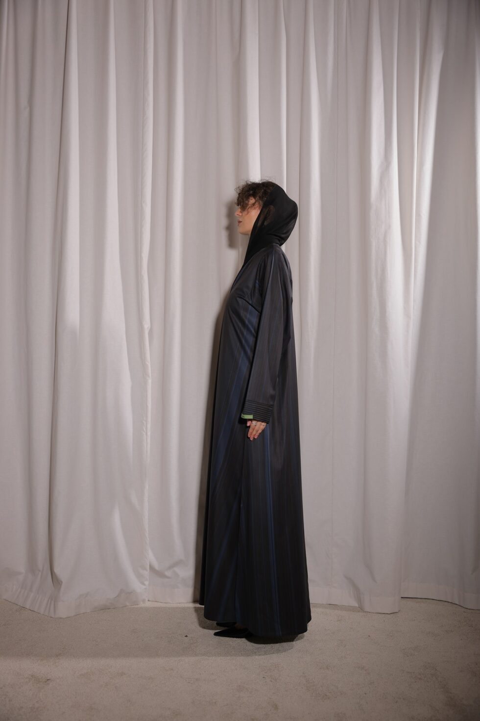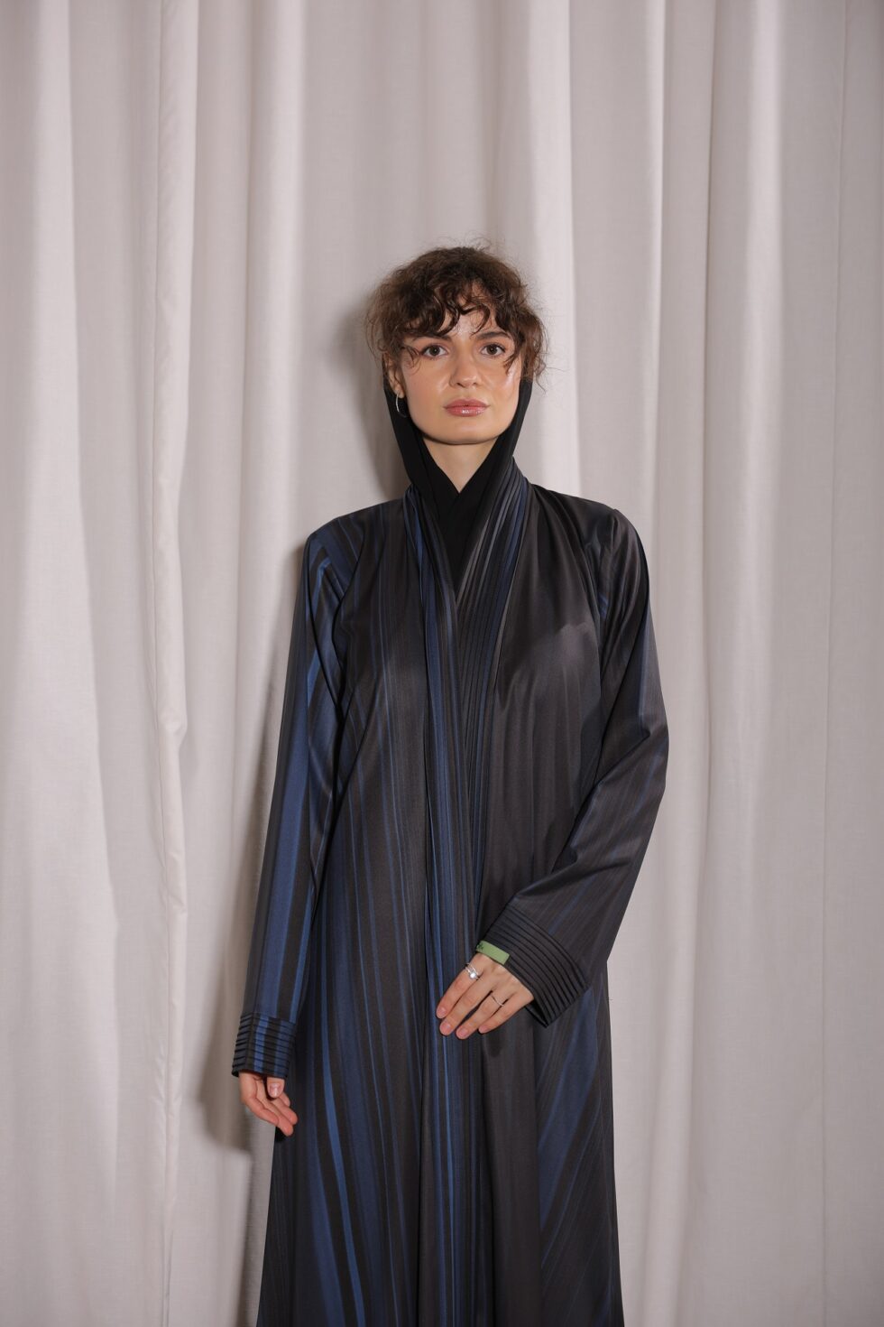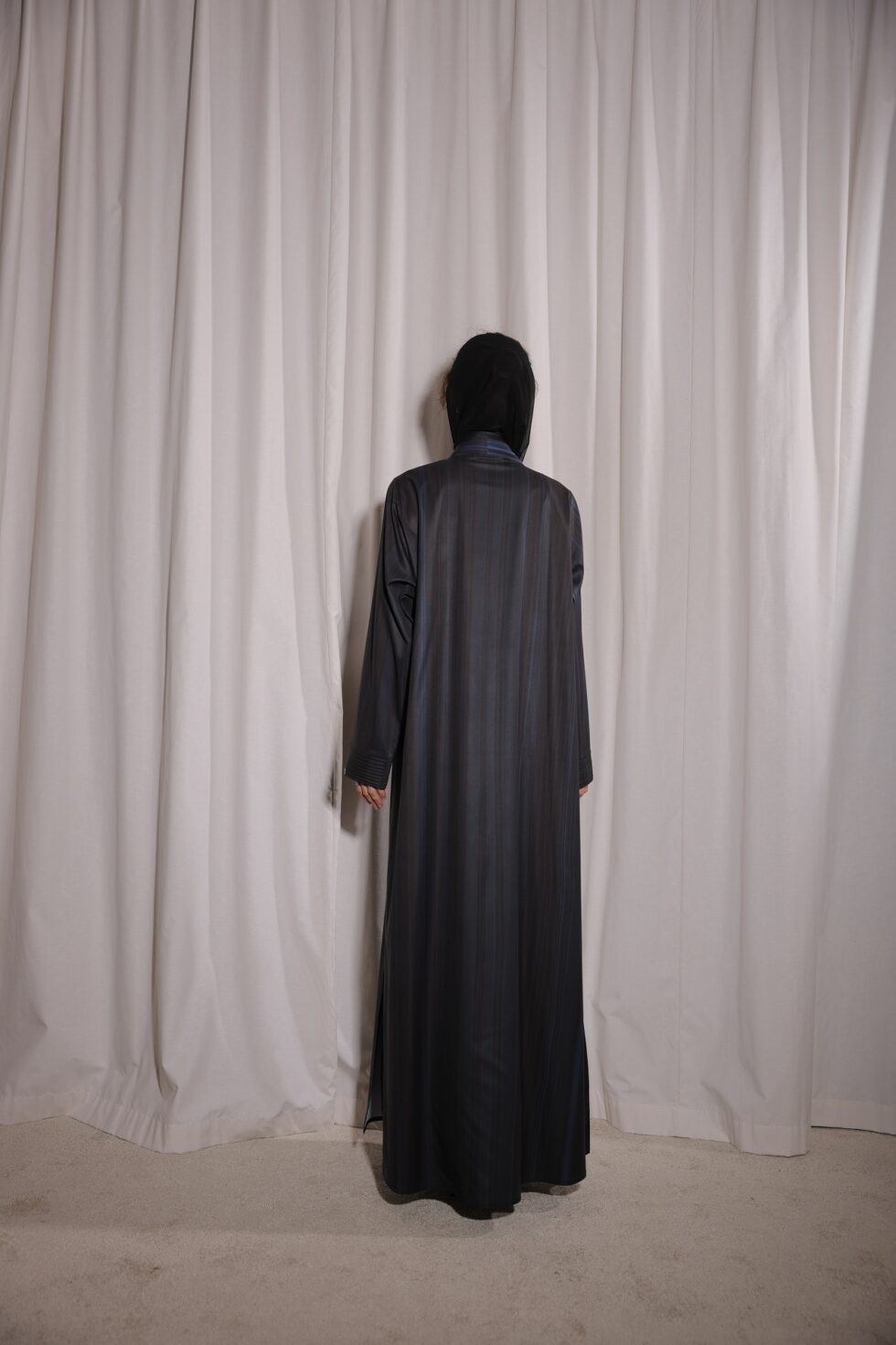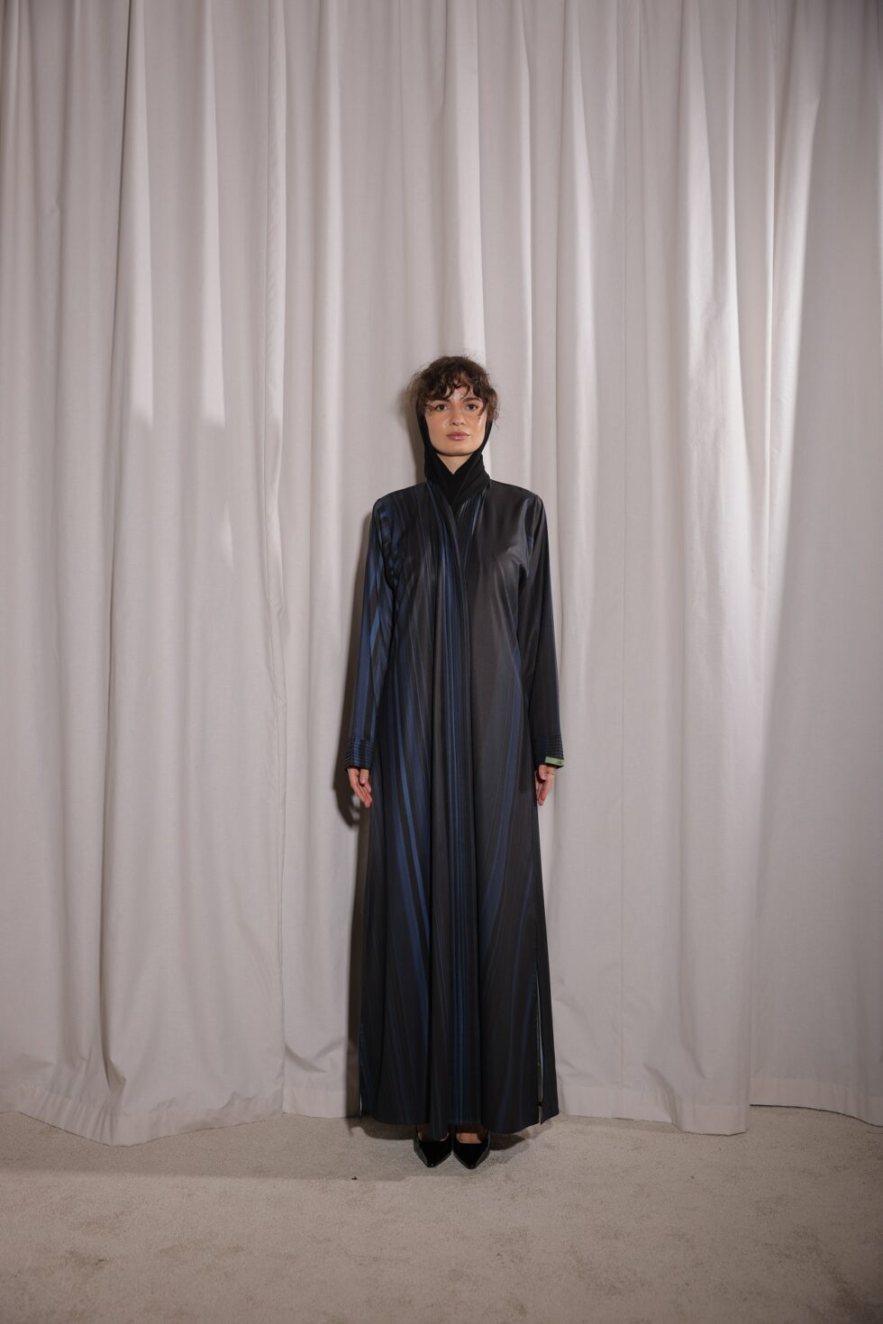 Step into sophistication with the Blue Black Shades Abaya, a modern piece designed for women who appreciate elegance with a contemporary twist. Crafted from premium fabric, this abaya features sleek vertical stripes in shades of black and blue, creating a slimming and graceful flow.