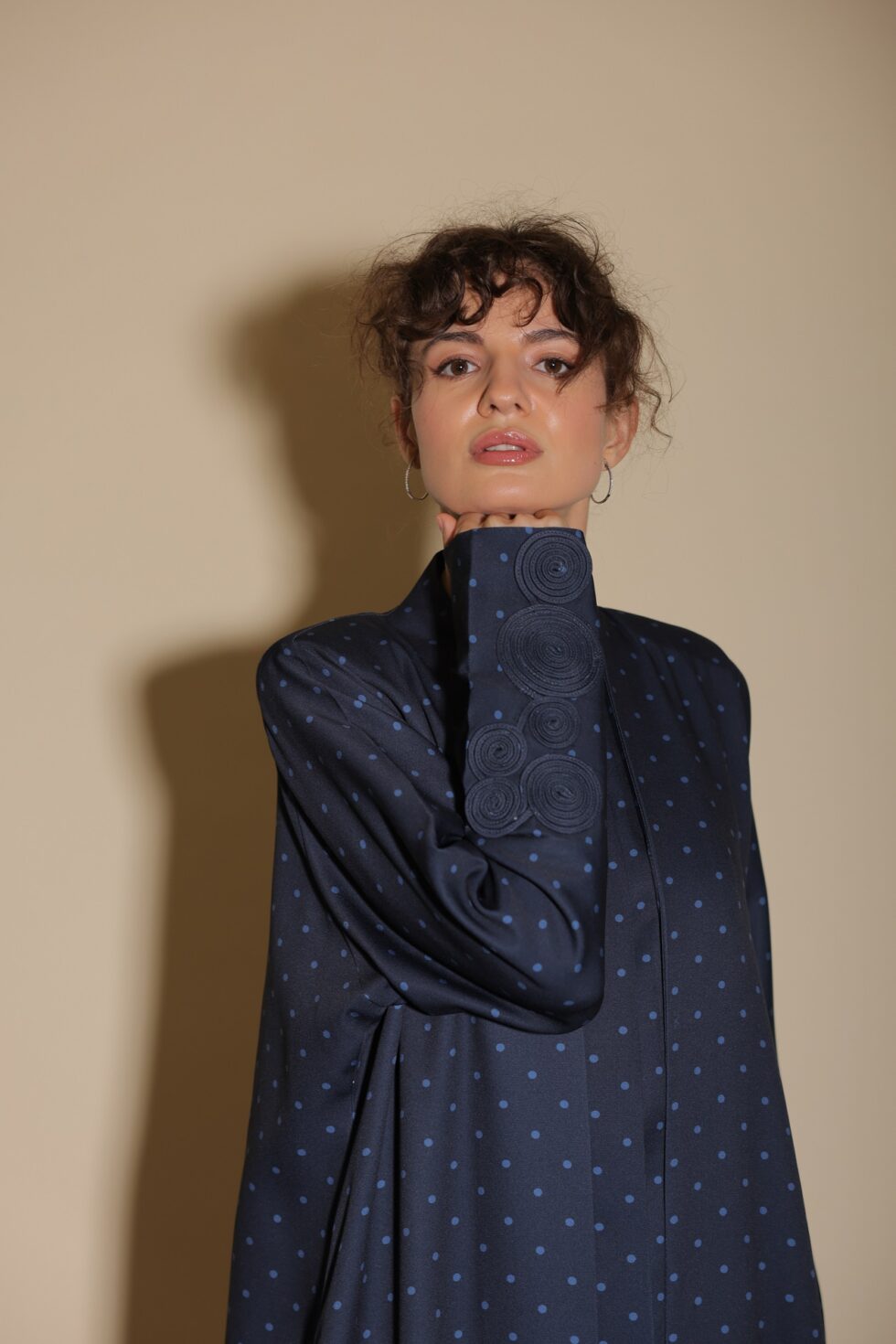 Elevate your elegance with this modern navy blue abaya, adorned with subtle dotted patterns for a timeless yet contemporary look. Crafted from premium lightweight fabric, it offers a graceful flow and all-day comfort.