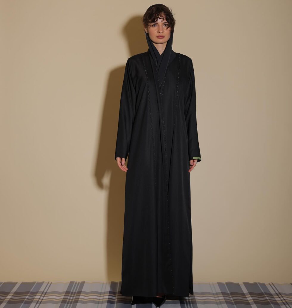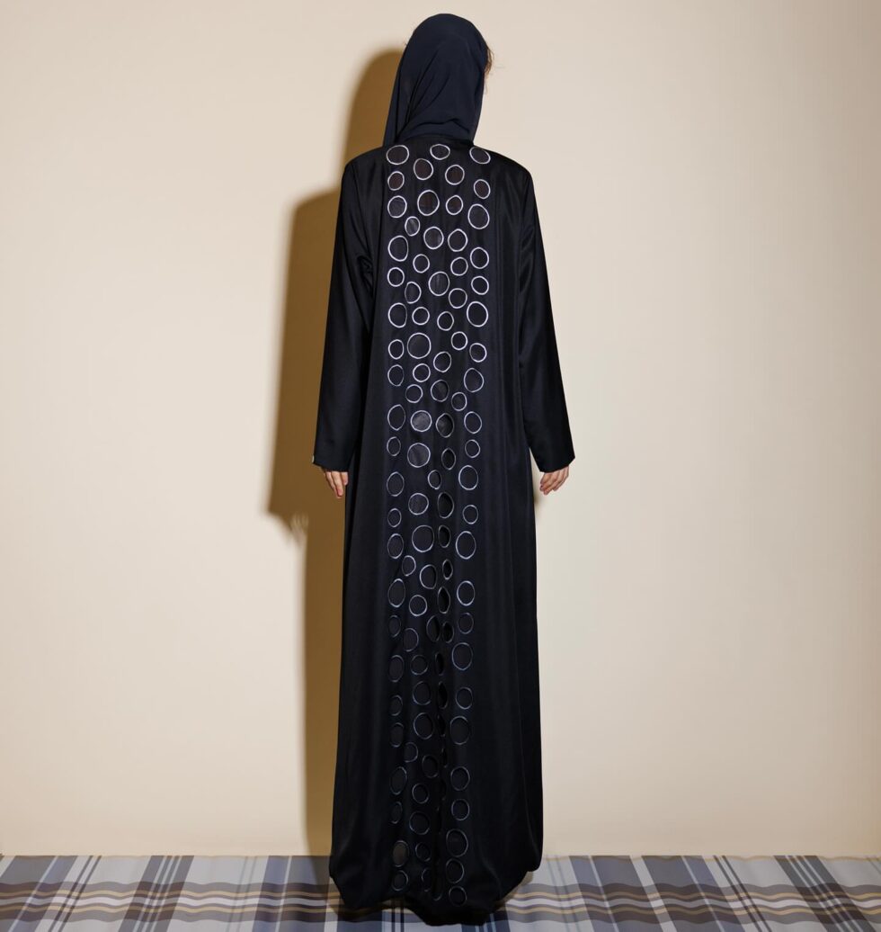 A modern masterpiece, the Orbit Shades of Grey Abaya combines bold design with timeless modesty. Crafted in sleek black fabric, the back panel features an artistic cascade of grey circular patterns, creating a striking visual flow that blends elegance with contemporary flair.